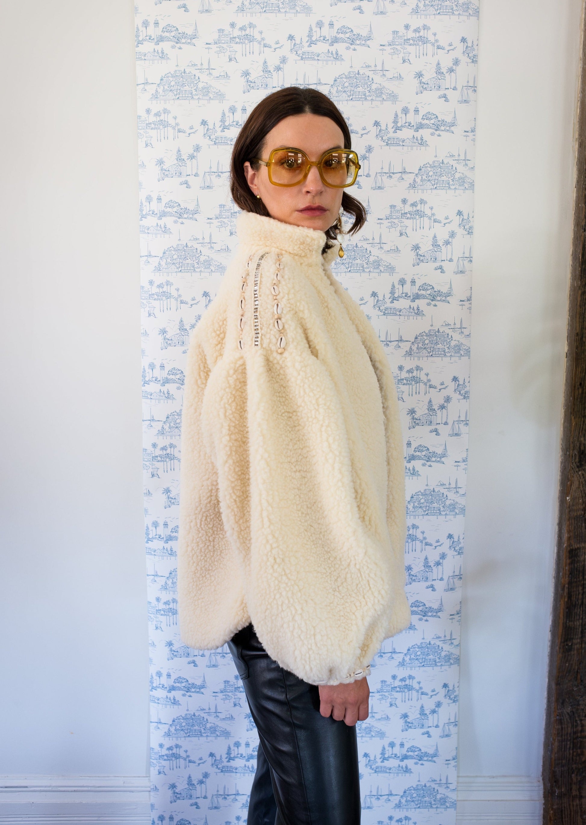 Our Concord Coat is cut from the most beautiful Italian wool sherpa in a natural unbleached shade on a knitted base. Warm, thick, and bouncy this coat will keep you super toasty without feeling heavy on the shoulders. It's lined with a unique hand block organic cotton print from Jaipur for a beautiful and playful contrast.