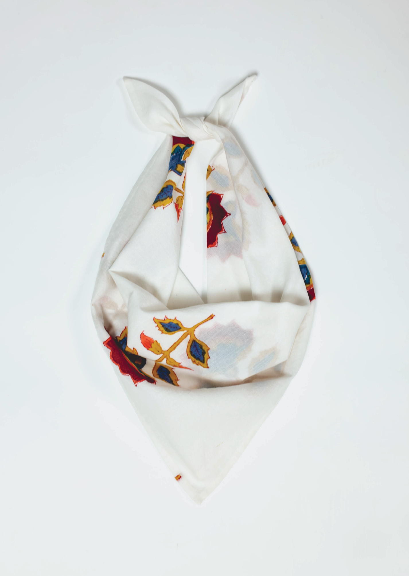 The Bloom Bandana was crafted from a unique hand block cotton print from India. Its edges were hand sewn for a long lasting finish.