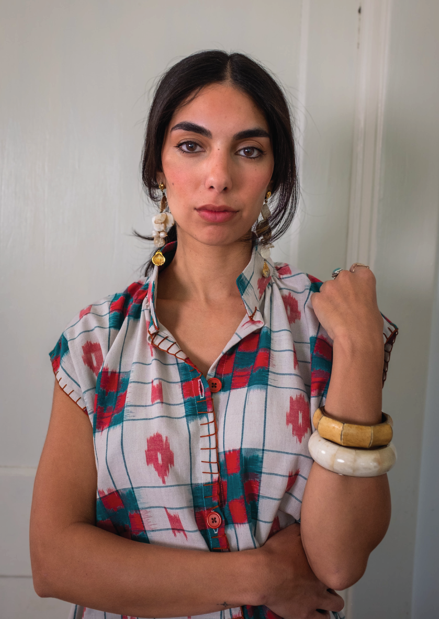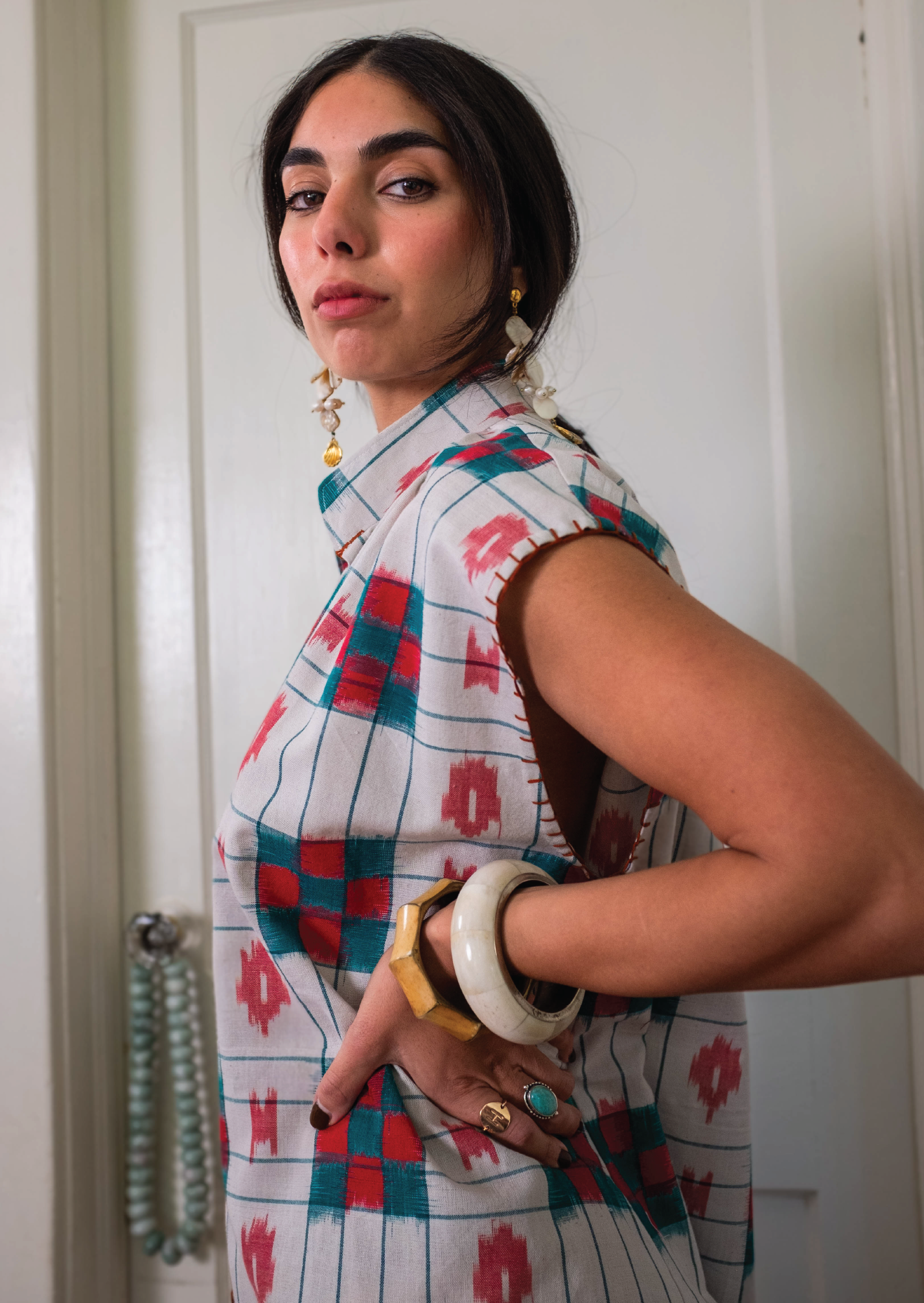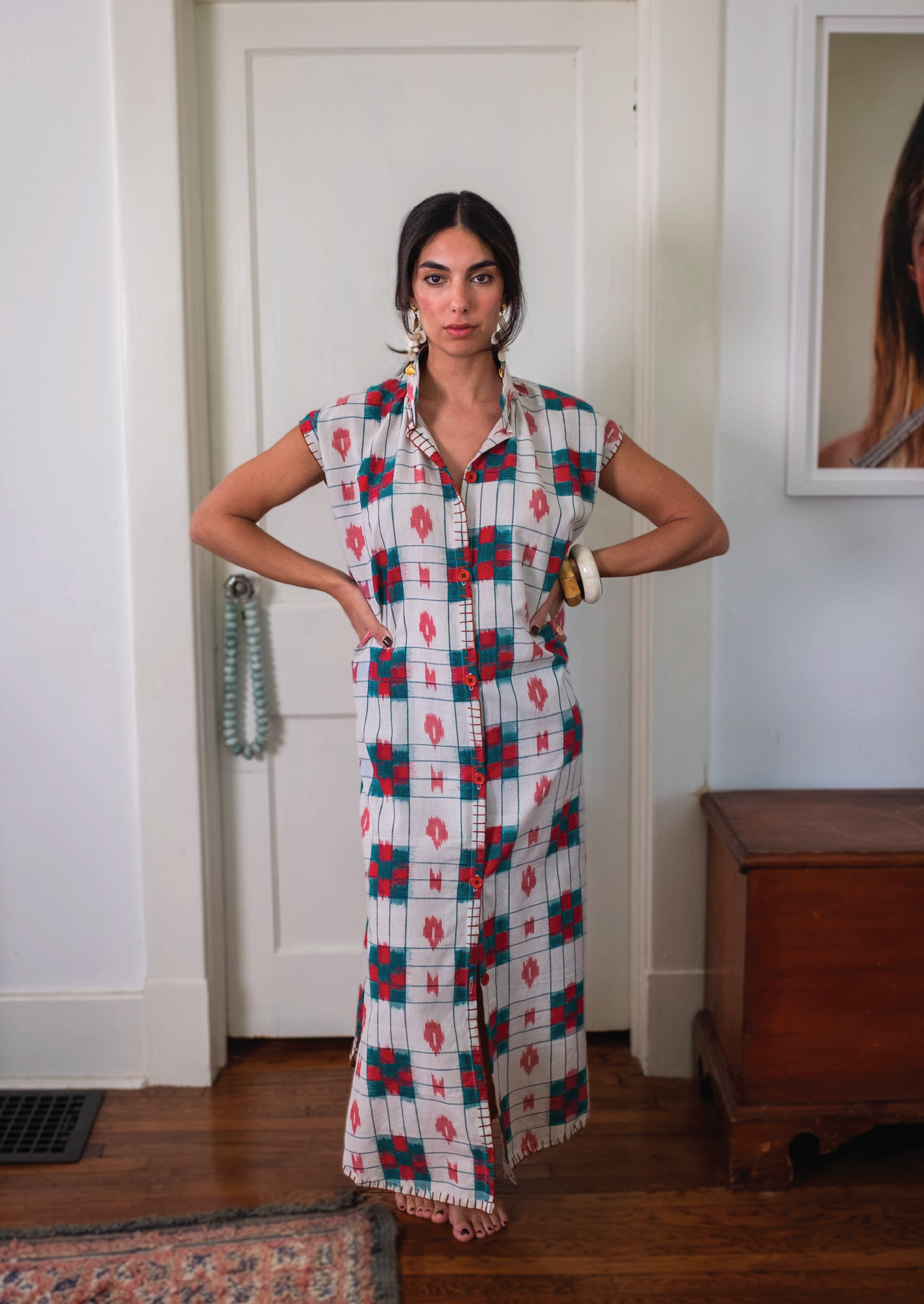 The Aylin Dress is crafted from woven aztec cotton in a mix of earthy colors. A hand embellished blanket stitch and button closures in a rust color leave an unexpected yet beautiful contrast against the cotton fabric. A loose and flowy fit provide for a very relaxed and comfortable feel.