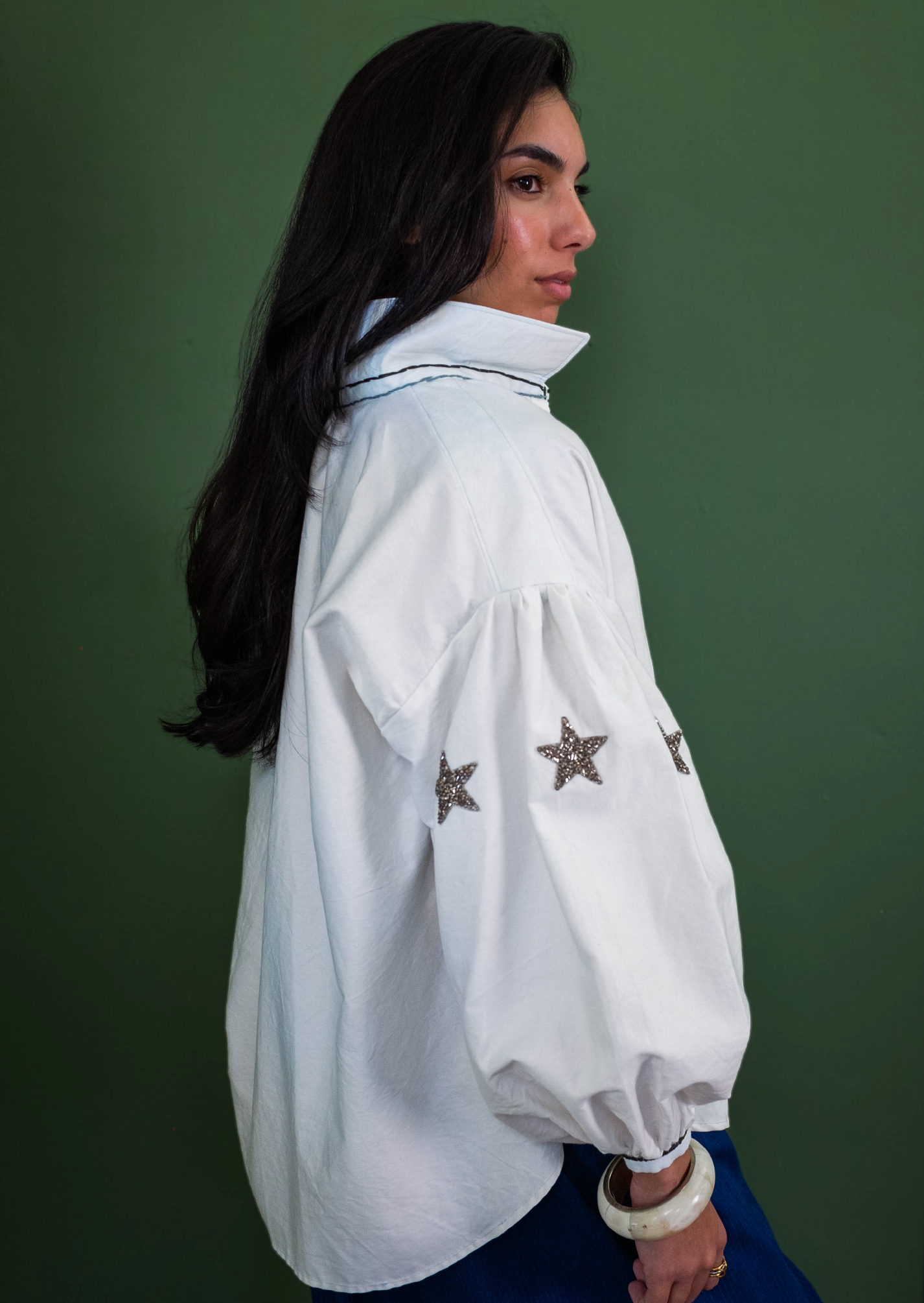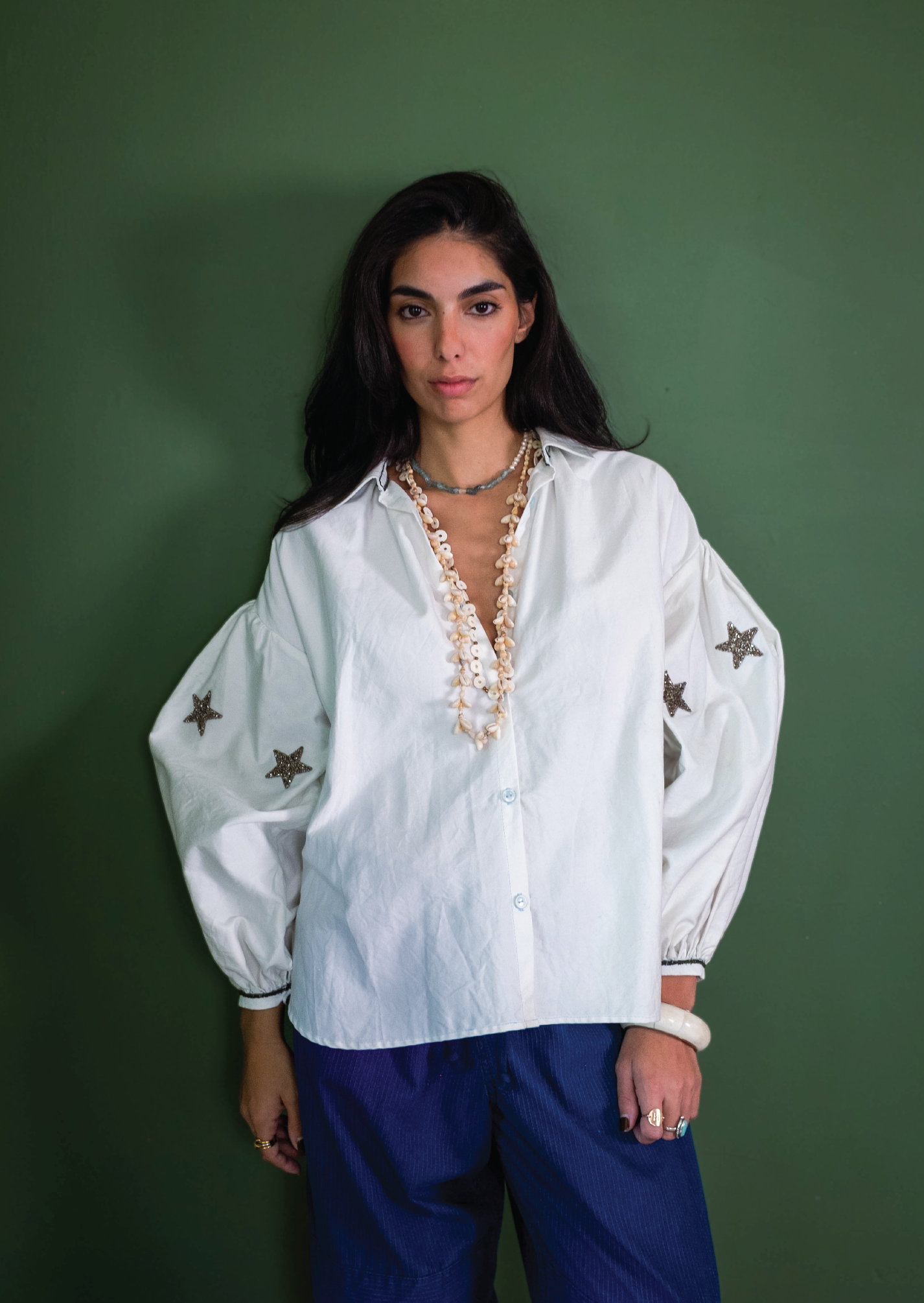 Hand dyed with organic indigo, this shirt resembles the open evening sky with its creamy blue color and adornment of rhinestone stars. It has blue and green hand embroidery stitching at the neckline and cuffs and has a perfectly loose fit, both comfortable and flattering.