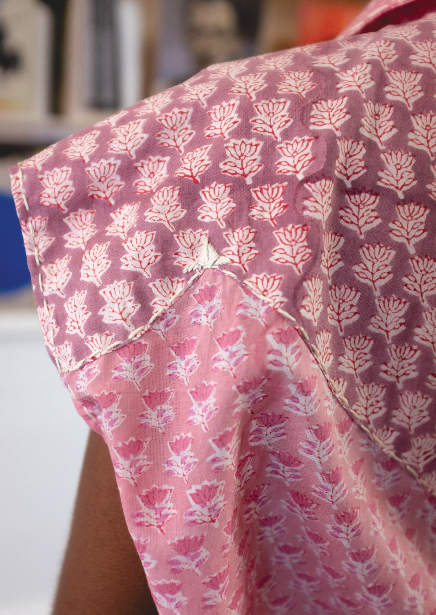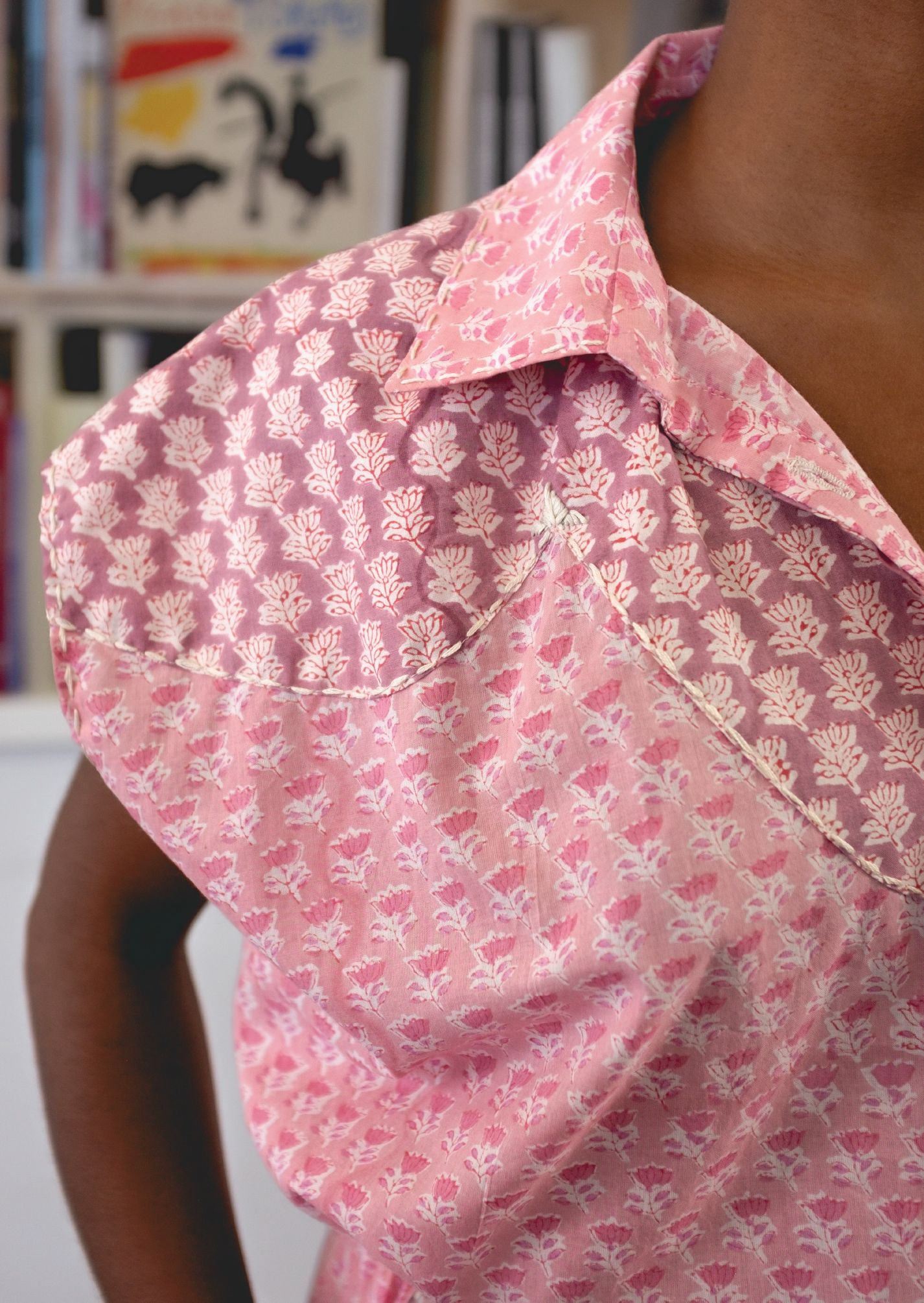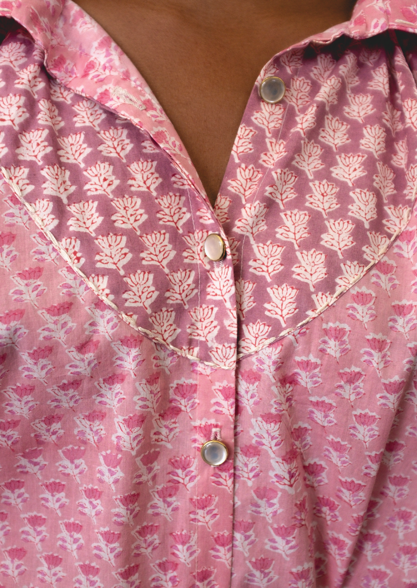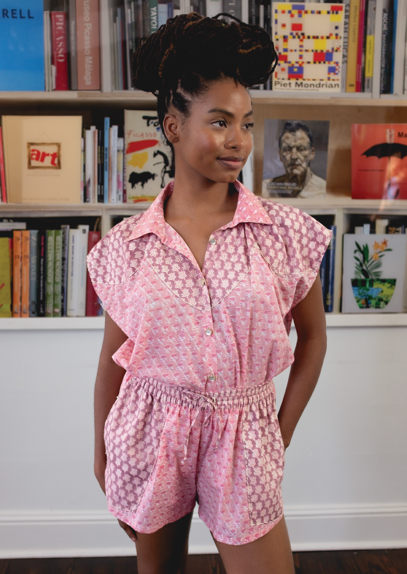 Crafted from a soft Indian block printed cotton in pink, purple and ivory, the Chelsea Top artfully masters comfort and ease. It is finished with ivory colored hand-stitched embroidery in a western style throughout and fastens with western style ivory colored buttons. Pair it with the Chelsea Short for an adorable, effortless look.