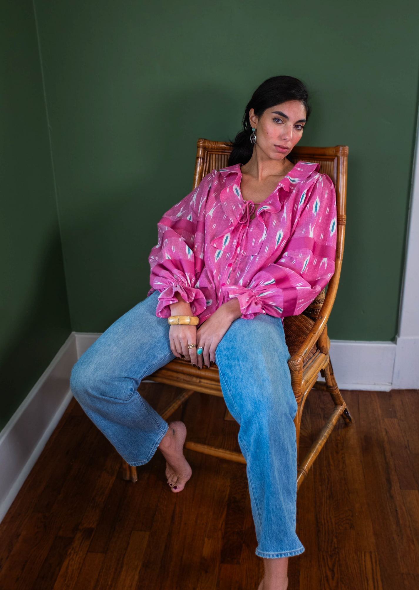 The Constance Shirt is crafted from woven aztec cotton in a stunning azalea pink and is adorned with antique French silk ribbon trim. A soft ruffle wraps around its neckline and ends at its center front placket with matching pink button closures.