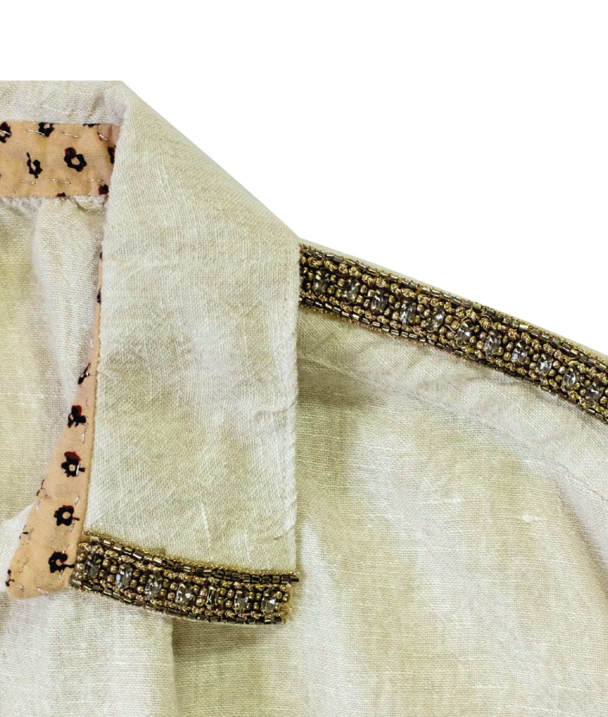 Gunmetal trim with rhinestones at the collar and shoulder serve as a pretty juxtaposition on top of its ecru colored linen. Sheen metallic thread detailing at the neckline and sleeve cuffs.