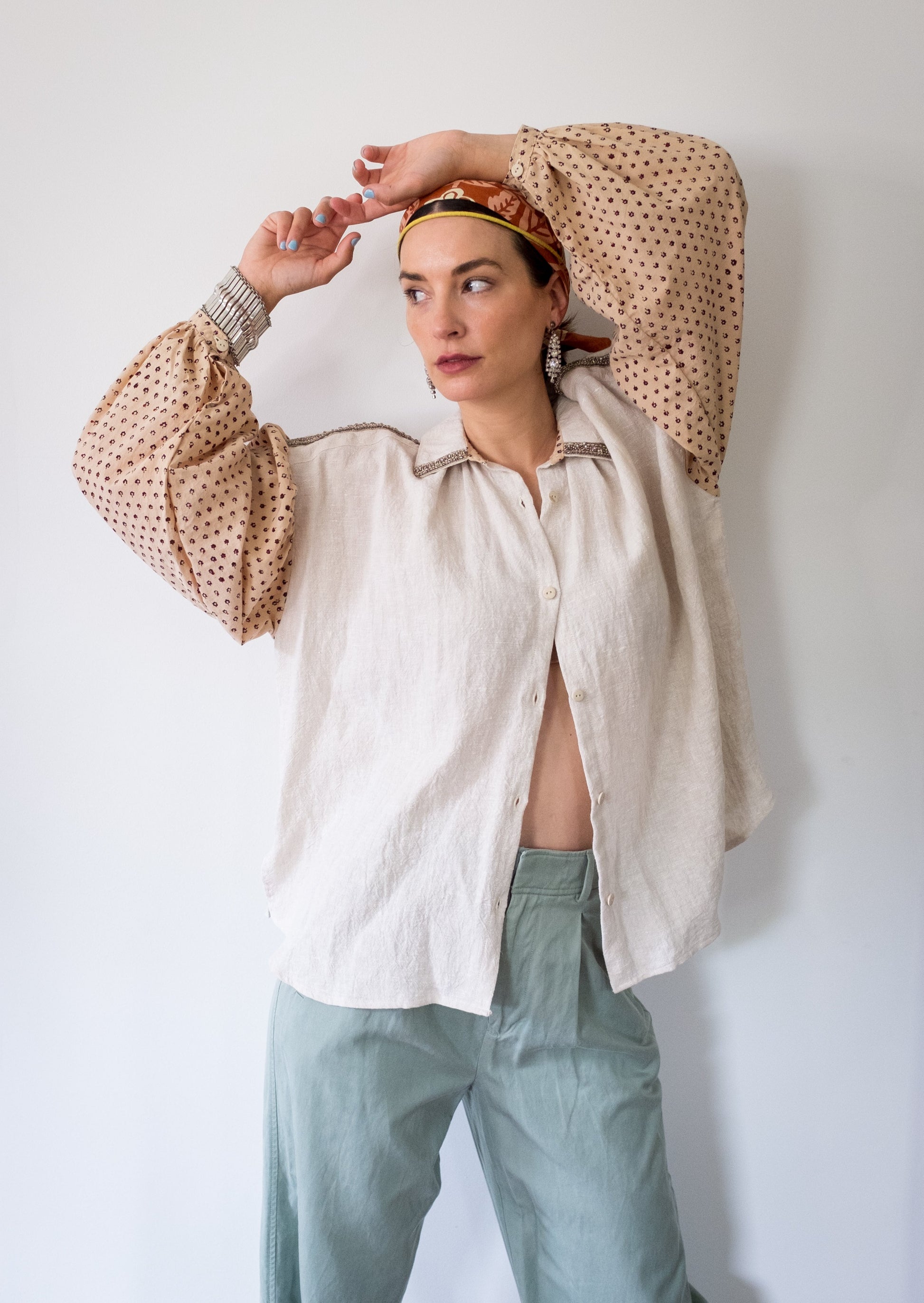This piece is crafted from linen produced in small batches in Europe where it is laundered and tumbled at the mill for softness. Its sleeves are cut from a unique hand block cotton print from Jaipur.