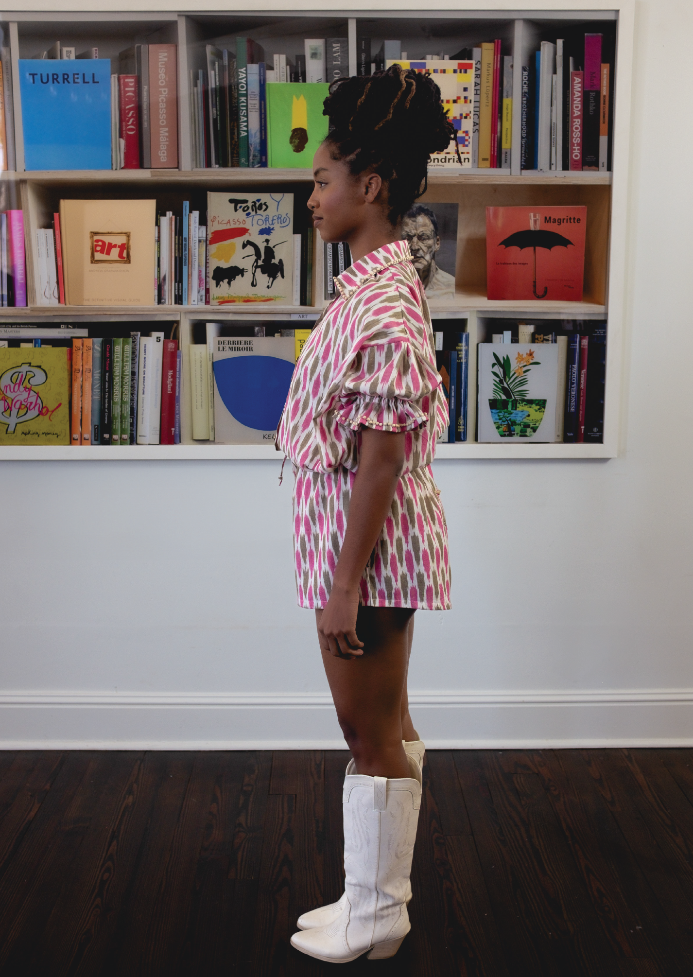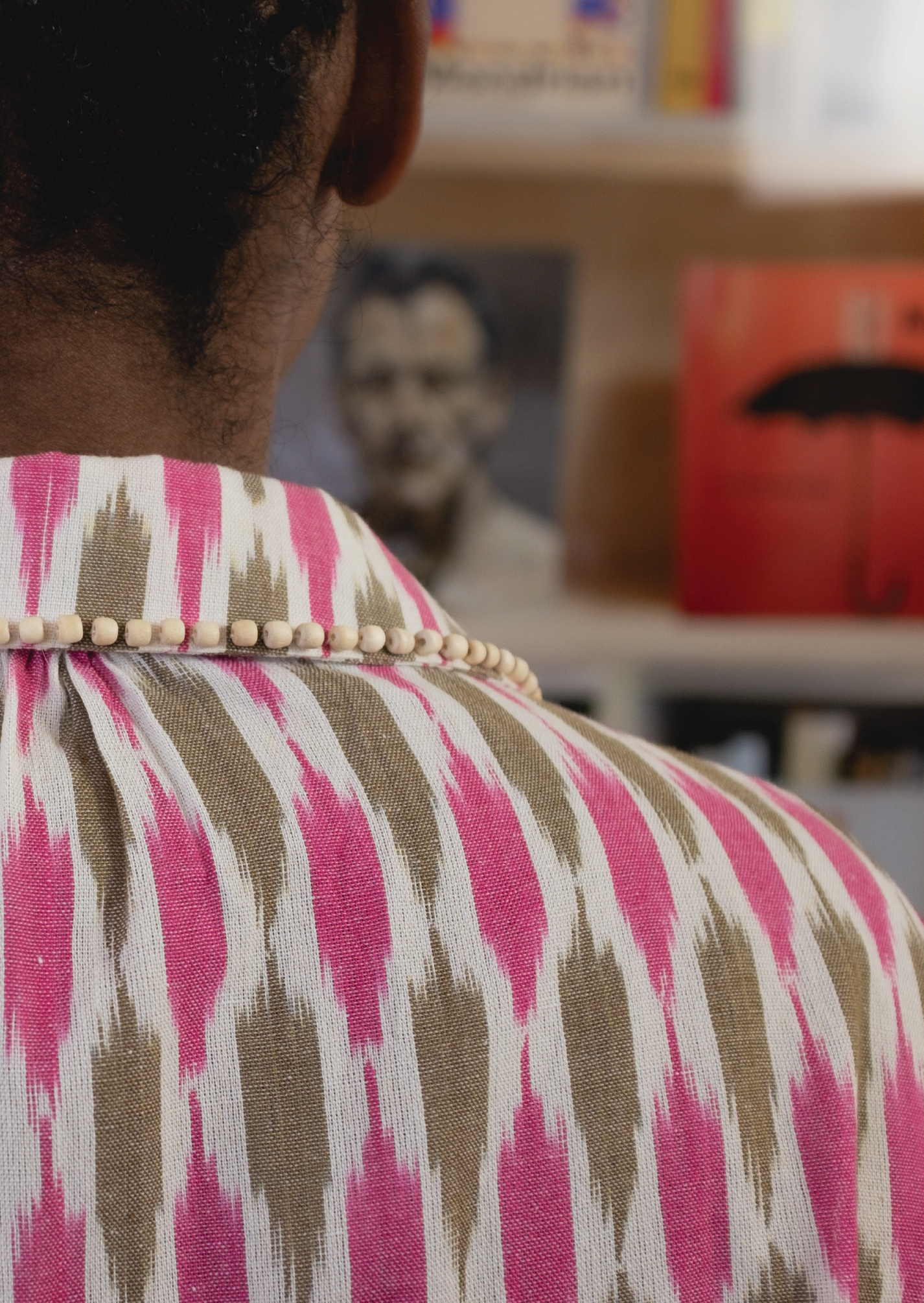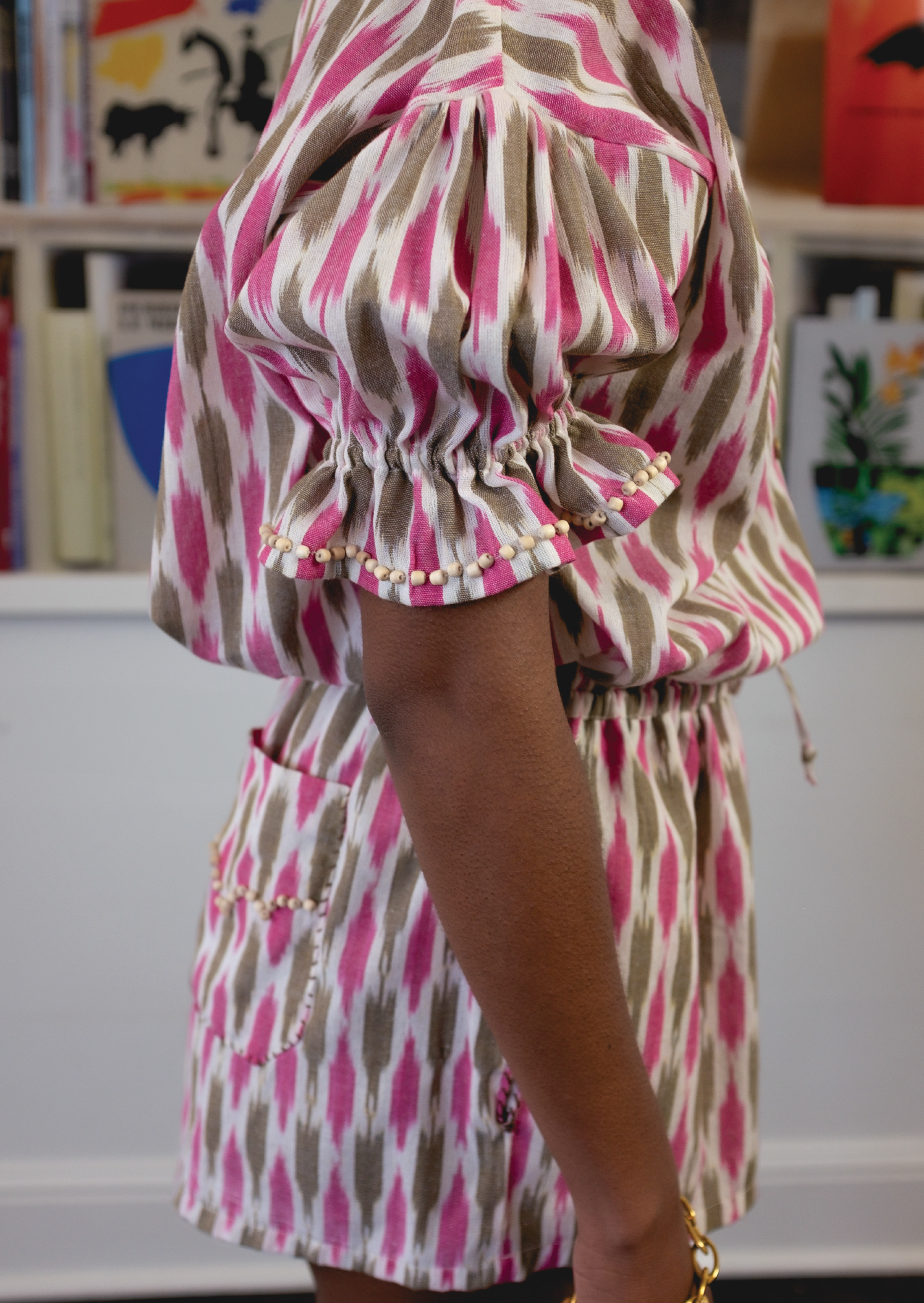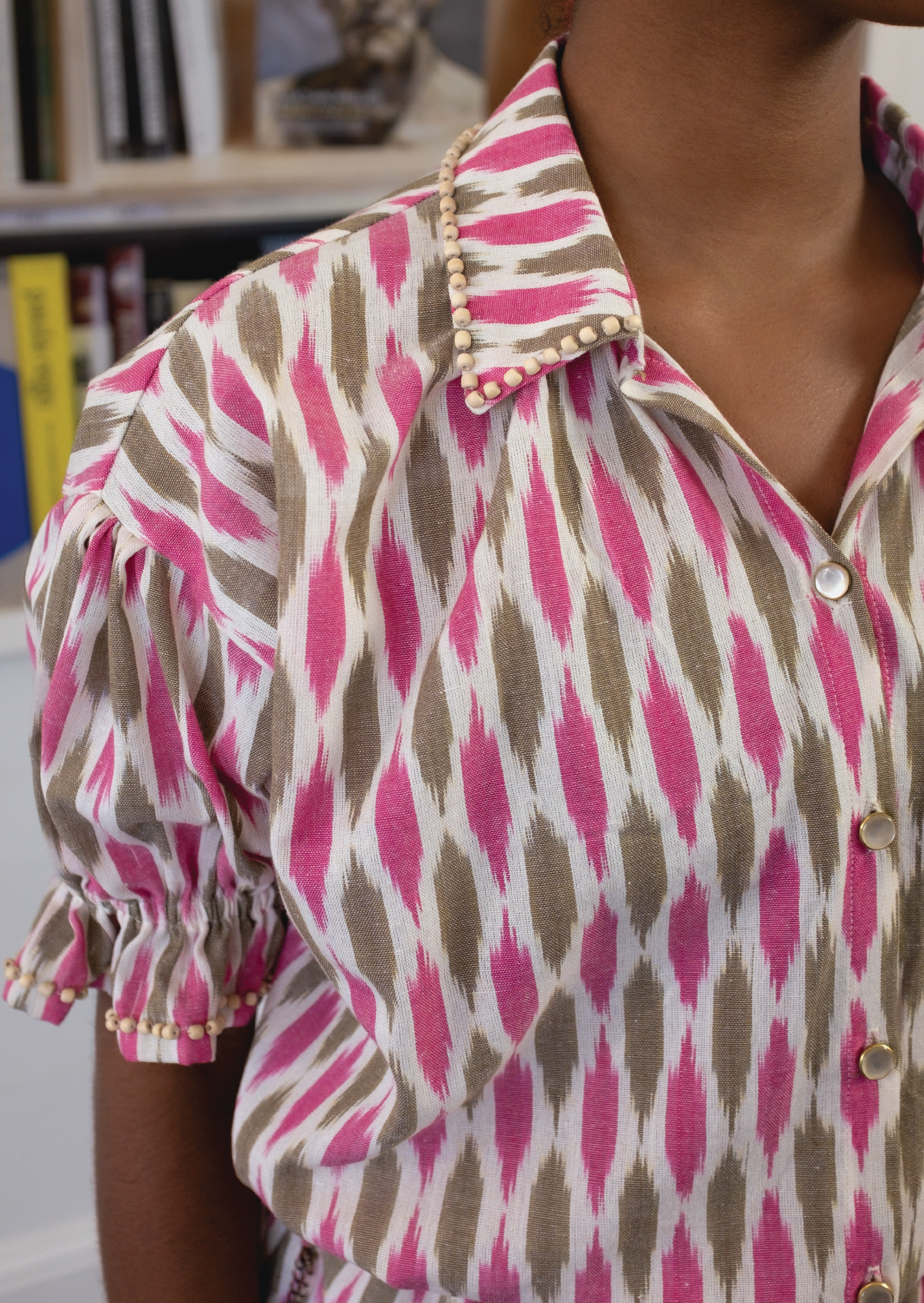 The Delilah Top is cut from a woven ikat cotton in an unexpected color combination of fuchsia and brown. It is adorned with small hand-stitched wooden beads around the collar and ruffled elastic sleeve edges that pop against its beautiful color-way, artfully mastering style and comfort. It fastens with western style ivory colored buttons. Pair it with the Delilah Short for an adorable, effortless look.