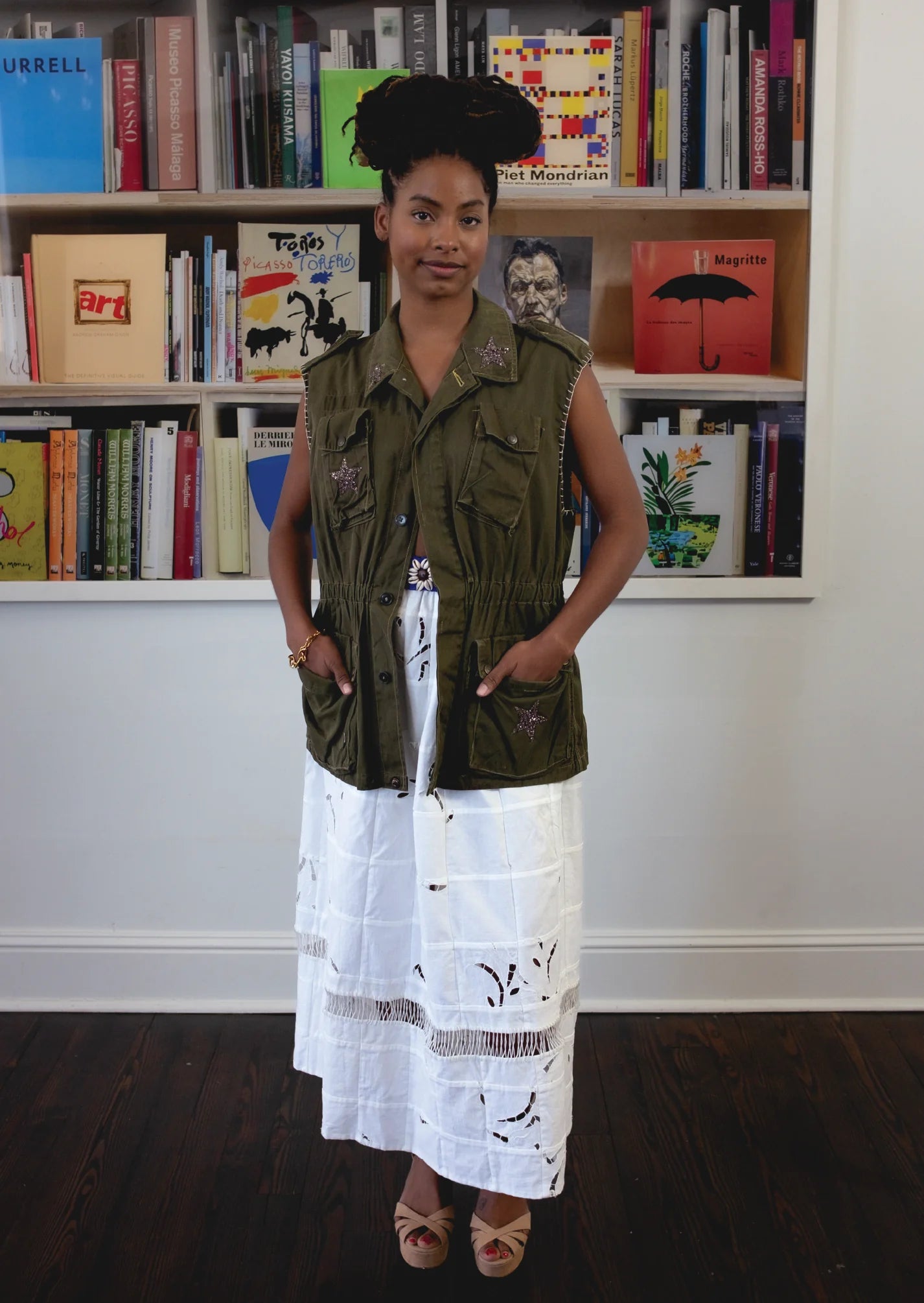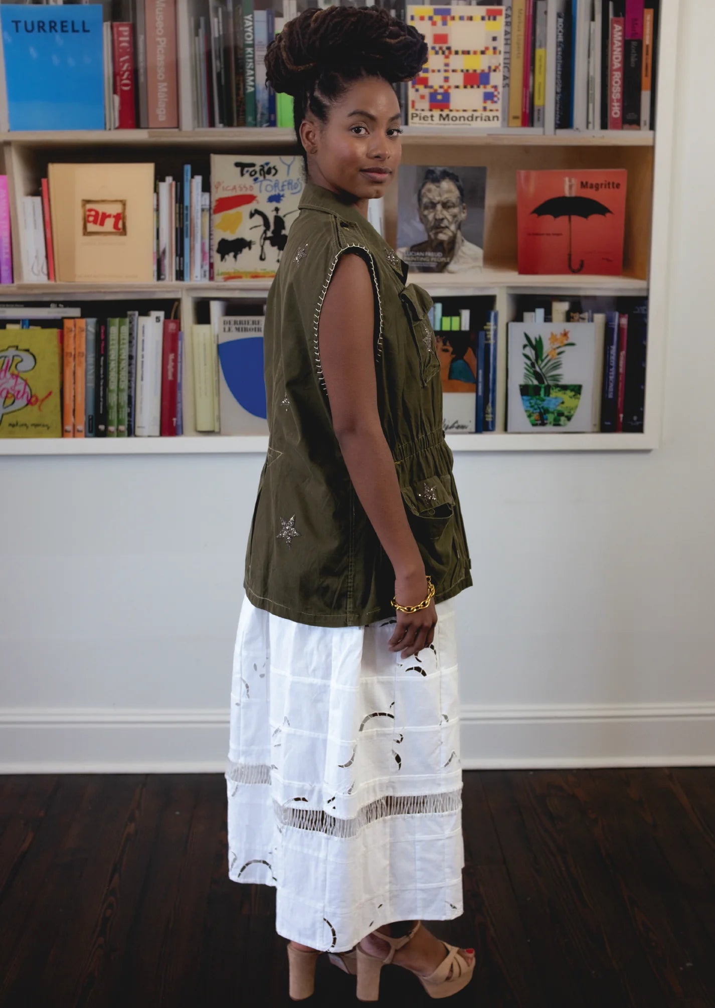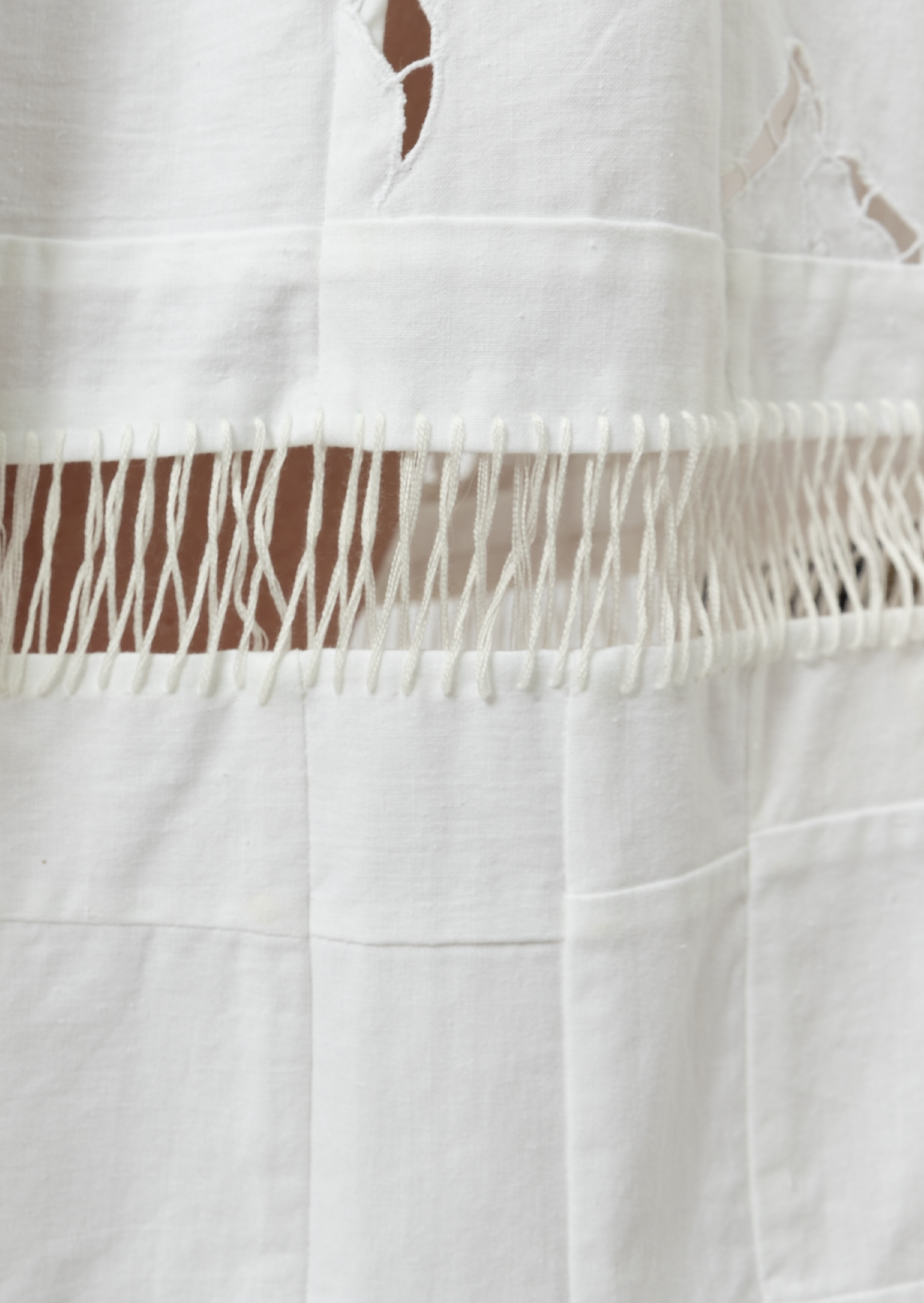 This absolute labor of love is crafted from a one-hundred year old cotton embroidered tablecloth. To avoid any markings it was cut into even squares and sewn back together with french seams.
