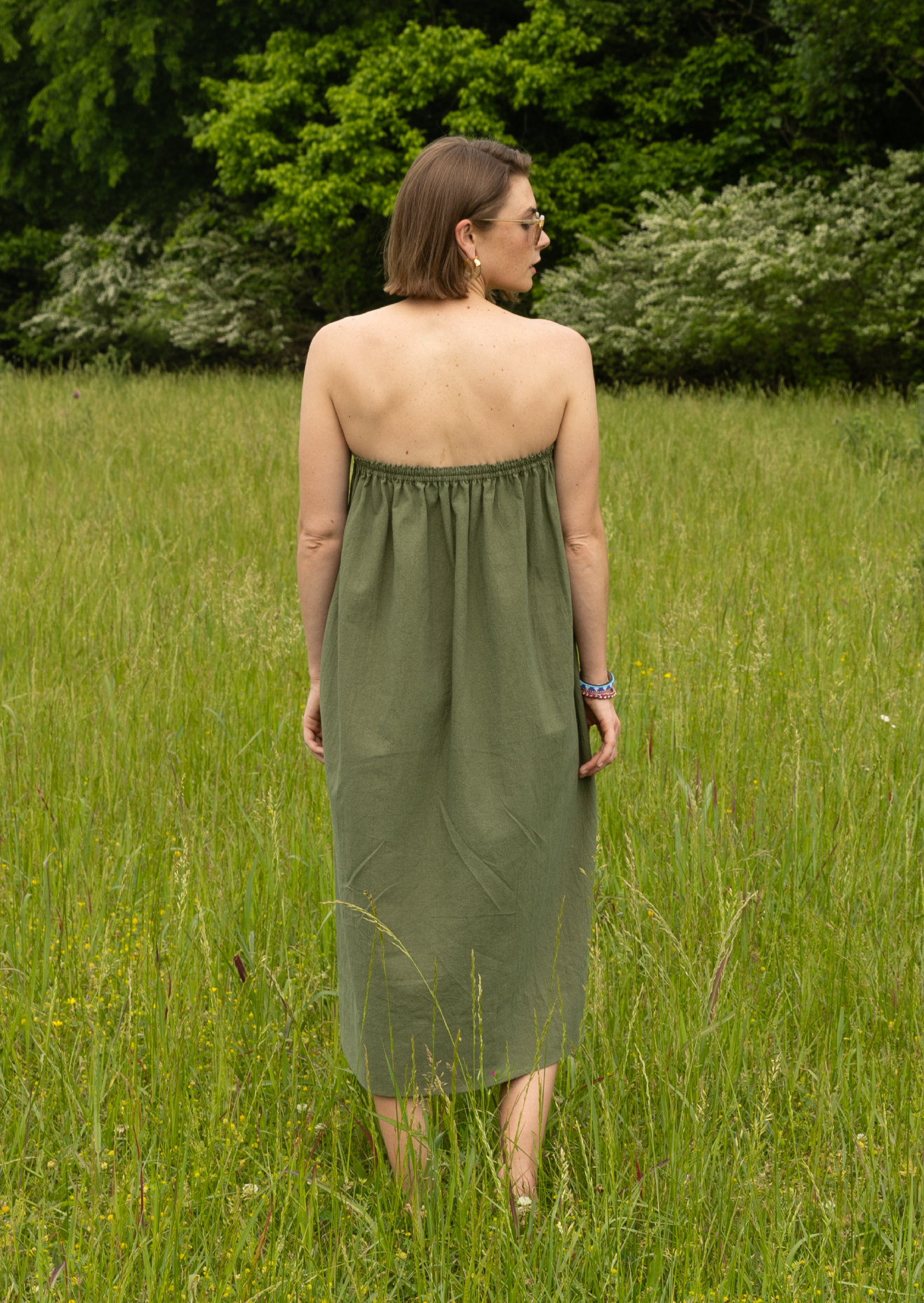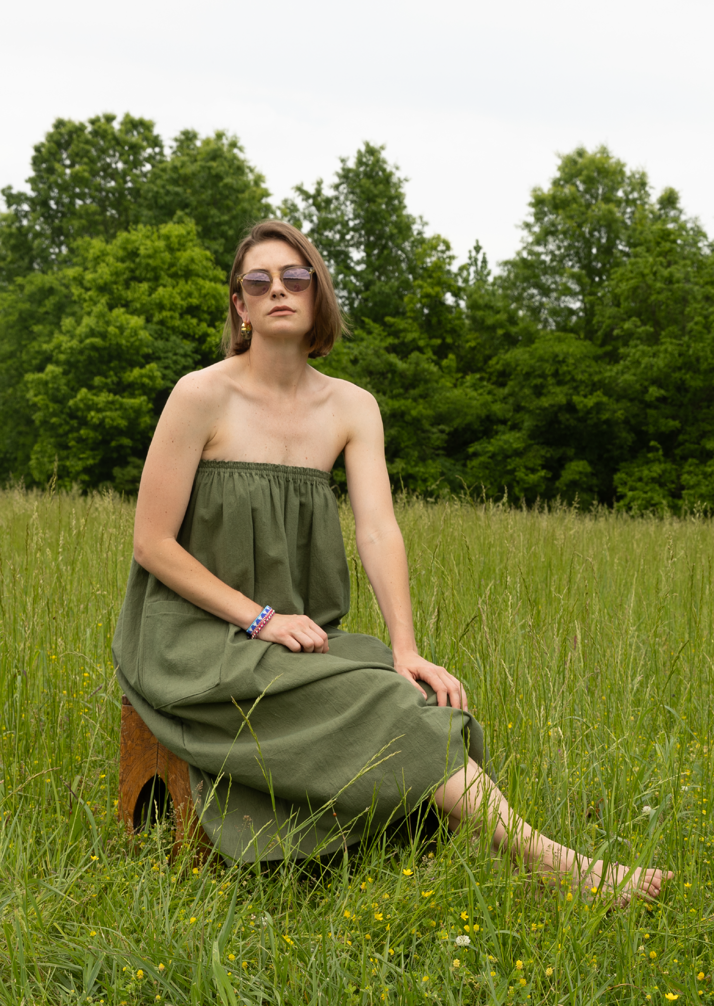 This dress has elastic at the bust and large pockets designed for an airy, relaxed fit.