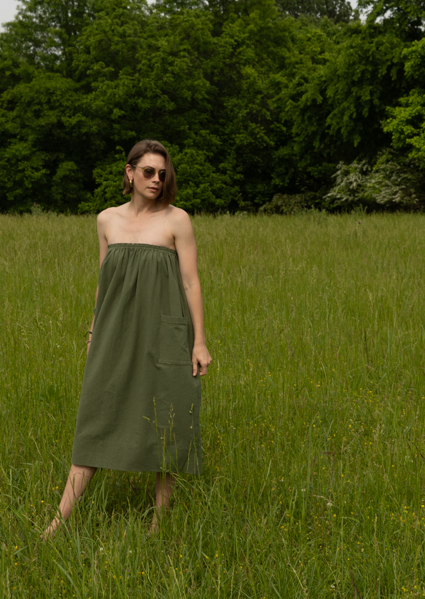 This effortless lovely is sewn from a beautiful dark green Japanese cotton with a dry crinkle texture.