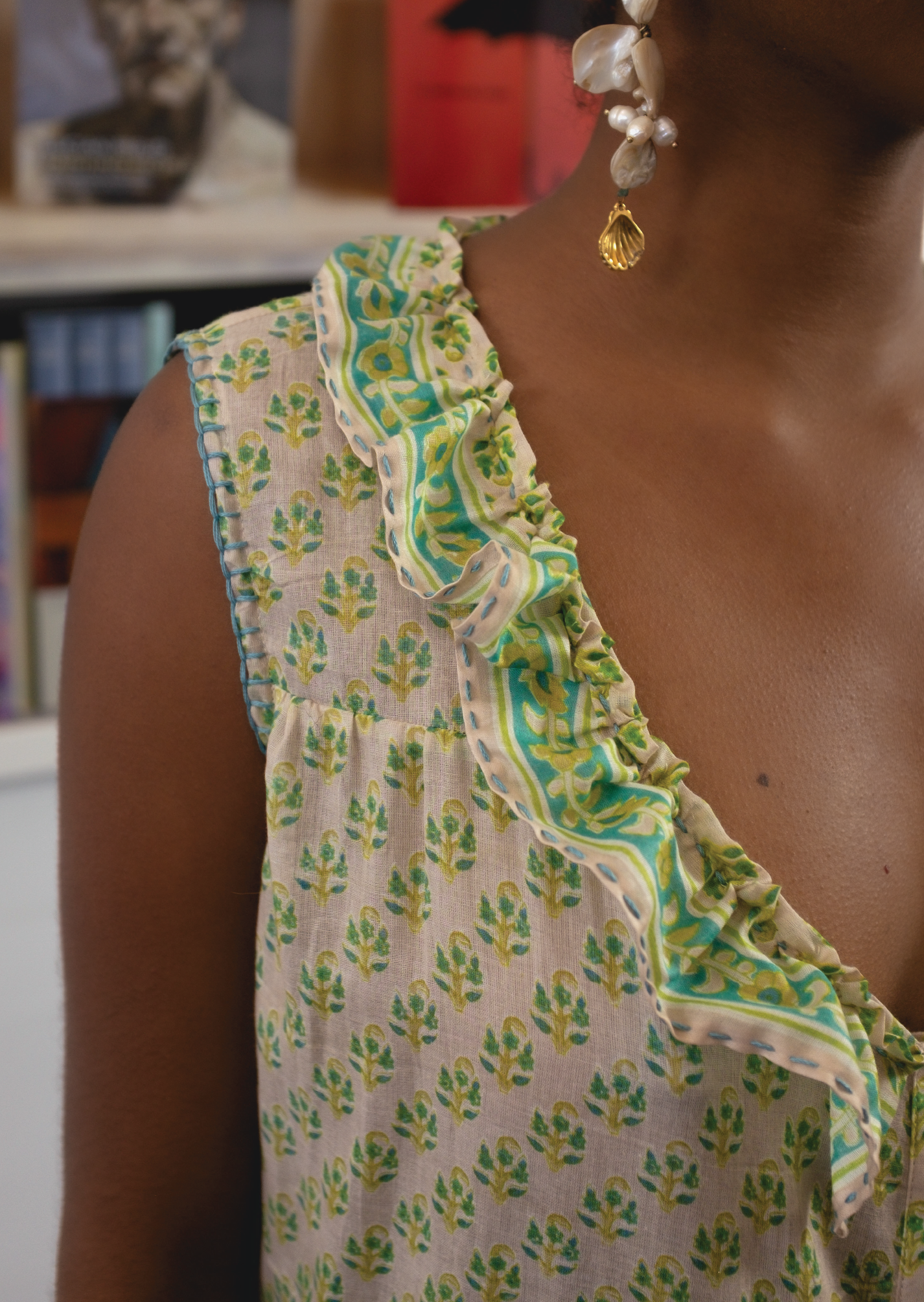 The Grace Dress is hand-cut from an Indian block print in the prettiest ivory, blue and bright green floral color-way. It has a delicate ruffle around its neckline with blue contrast embroidery stitching throughout. It fastens with iridescent colored shell buttons. Side slits give it a comfortable and effortless feel for the summertime heat.