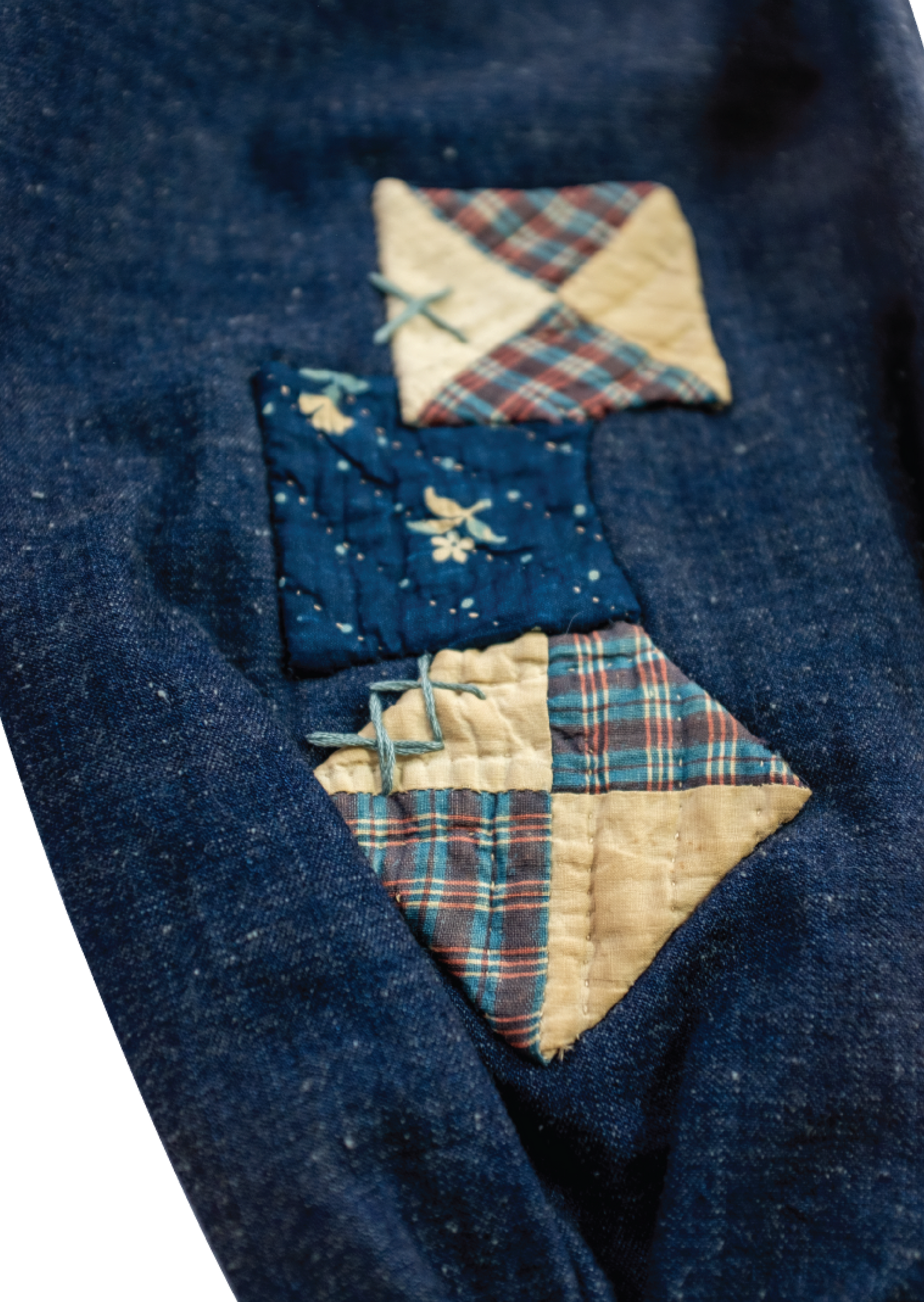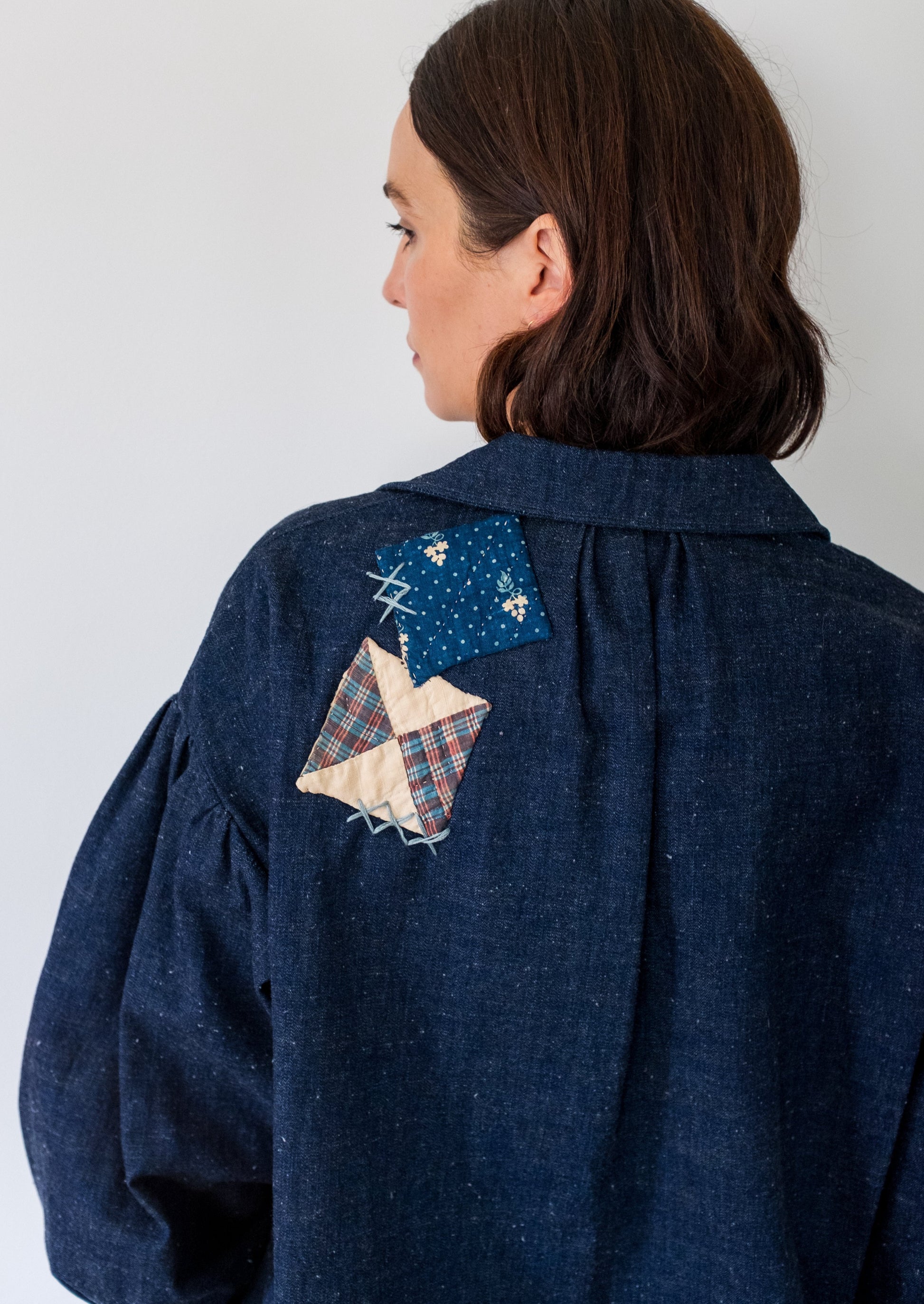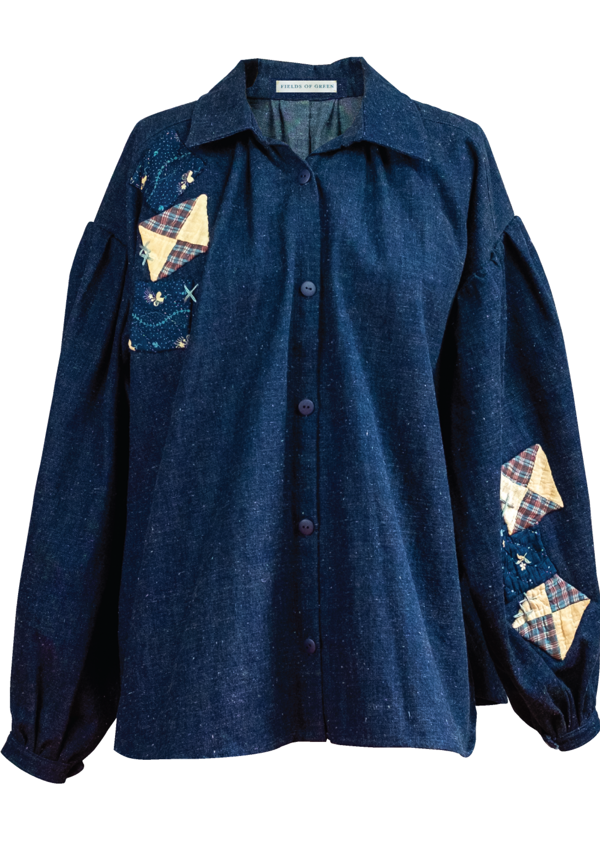 Inspired by Jo March, this shirt was made from a very soft Japanese cotton denim in a beautifully rich indigo color. It's hand-stitched patchwork was originally from a civil war era quilt, an ode to the time of the literary character.