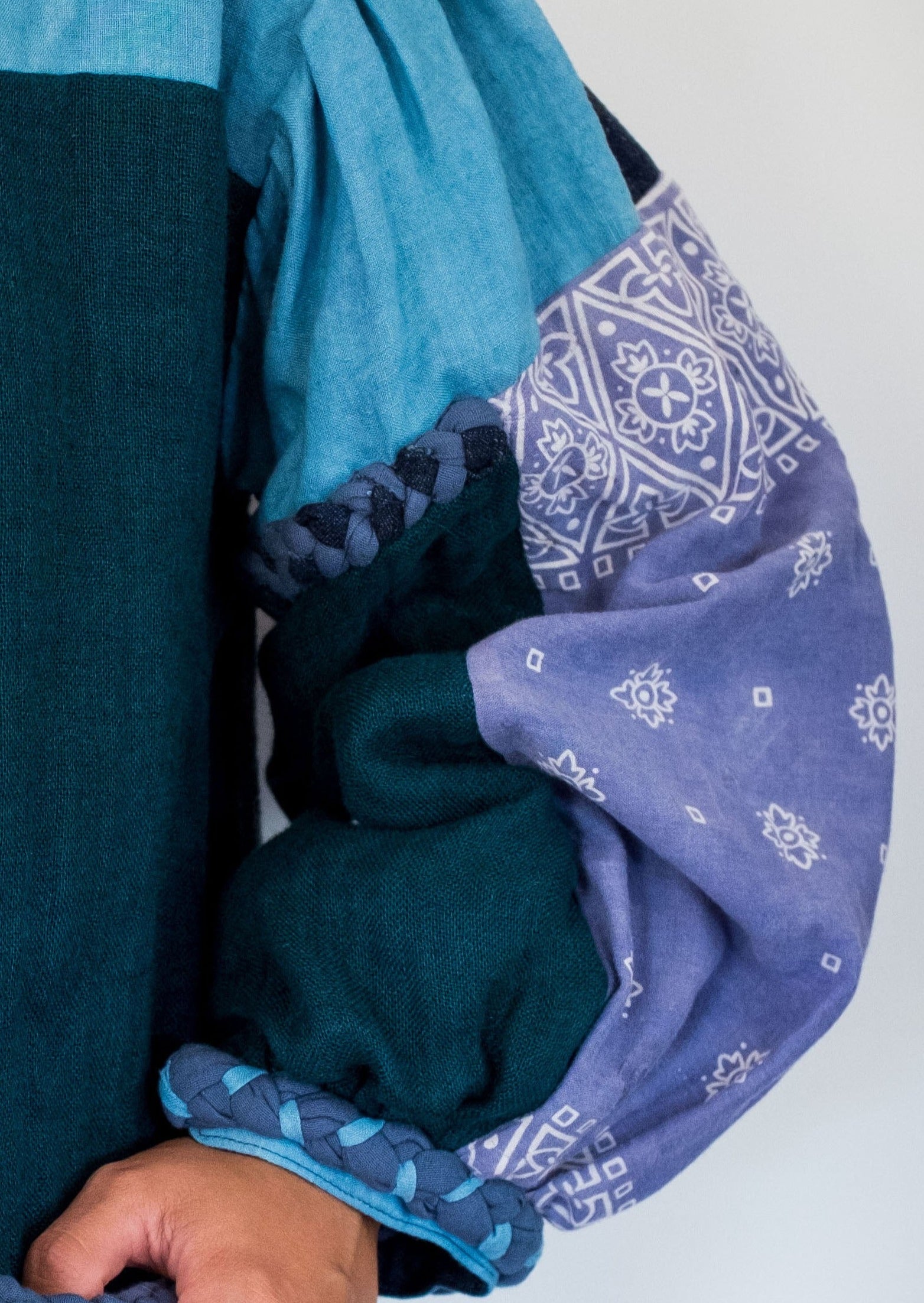 Made with a combination of six different beautifully textured fabrics all within the blue-green family yet each with their own story and purpose––a hand dyed linen, quilted cotton, soft cotton denim, vintage bandana, loosely woven wool, and a cloth with two layers of linen and wool invisibly stitched together, in turn to keep its wearer warm.
