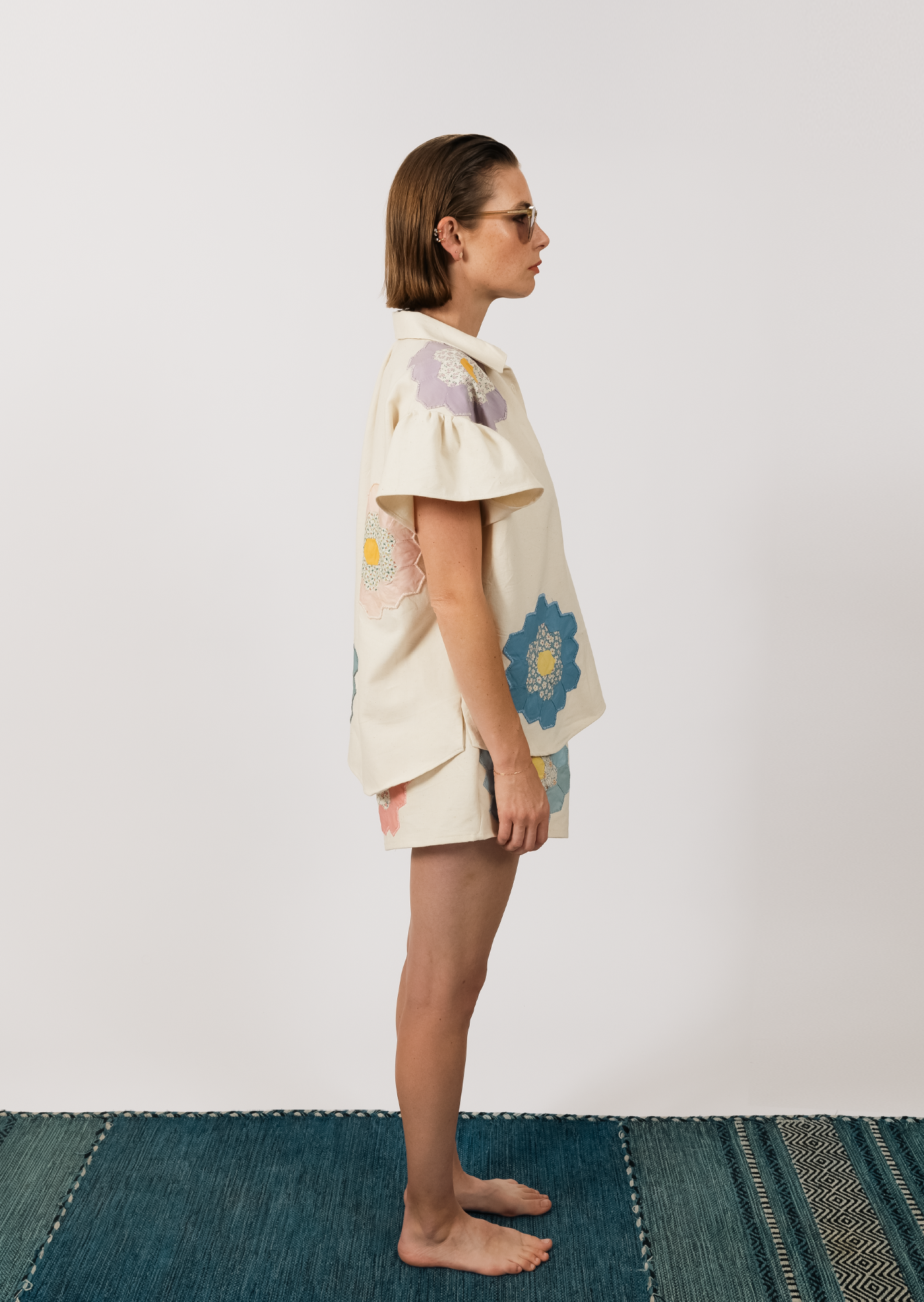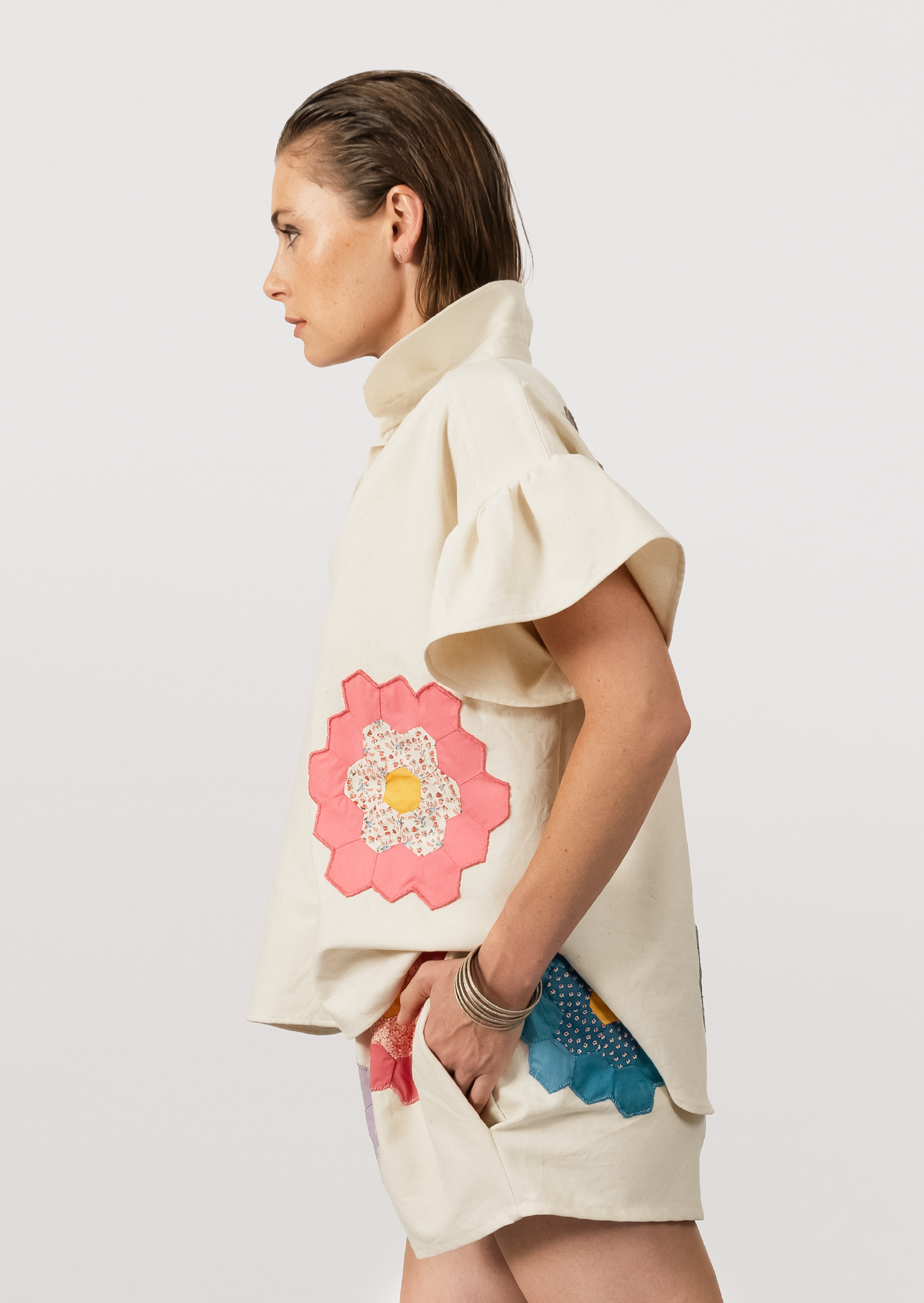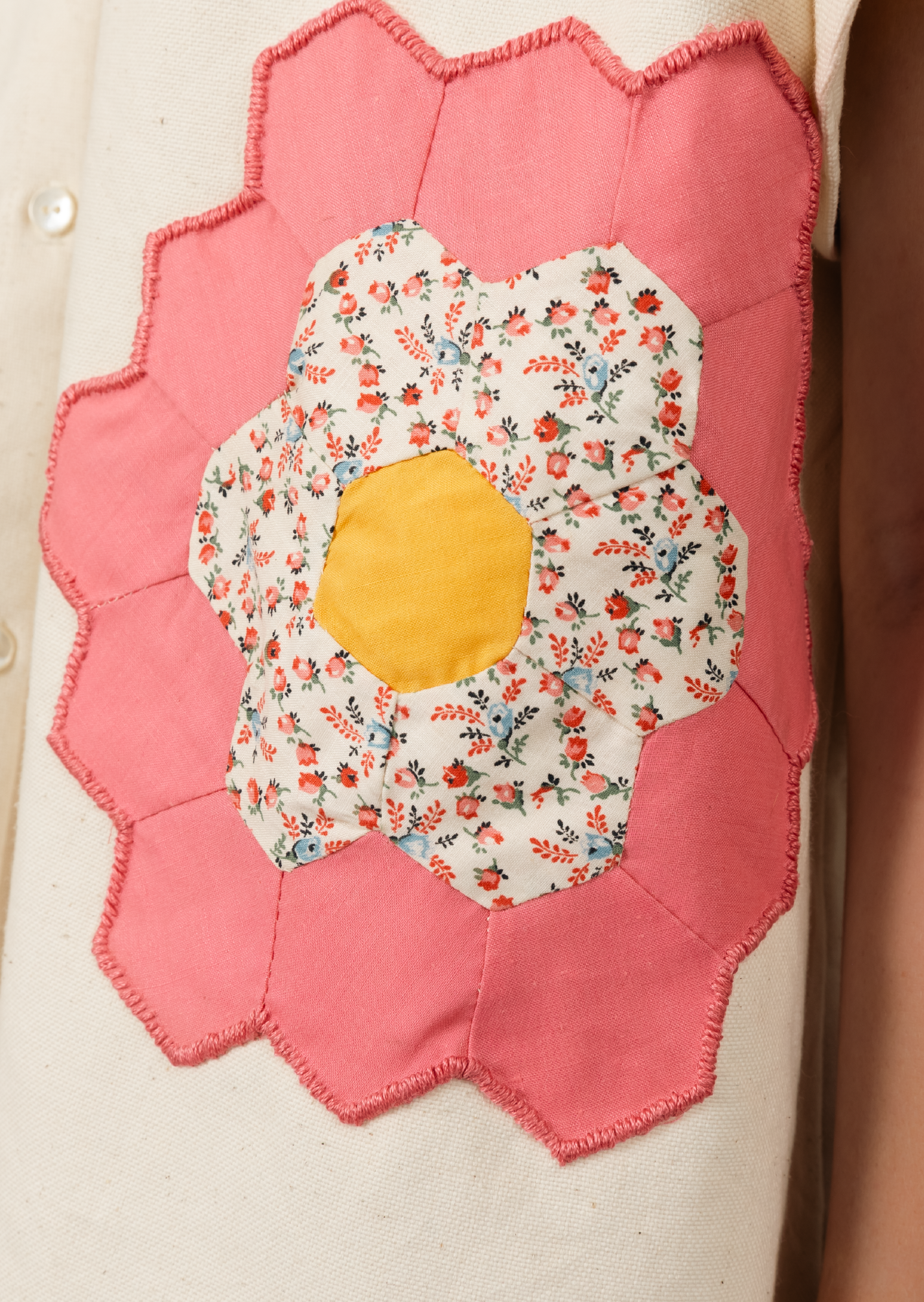 The Meadow Top displays the beautiful artistry of quilting with grandmother's flower garden patches, originally hand stitched in the nineteen-thirties. These patches were placed onto the garment and carefully hand embroidered around each petal for a whimsical, bespoke design.