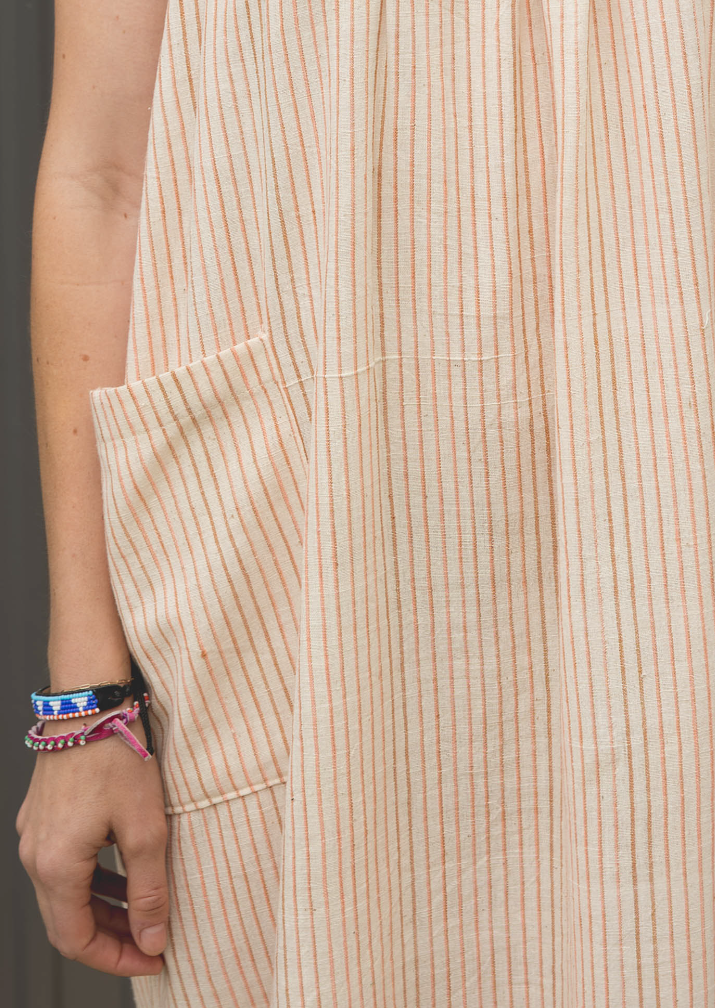 The Orchard Dress is made from a hand loomed cotton khadi from India with a woven stripe. This is a lightweight and soft cotton with a linen-y texture.