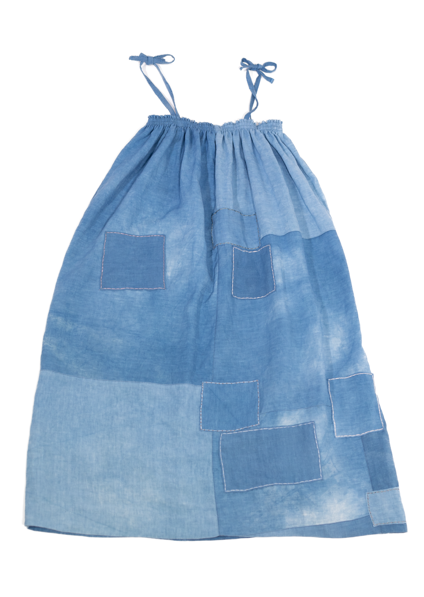 This soft Portuguese linen was hand dyed with indigo before being washed and tumble dried for extra softness. Patchwork in various indigo blues contrast in color with hand-embroidered stitching in laveders, pinks, grays and greens.