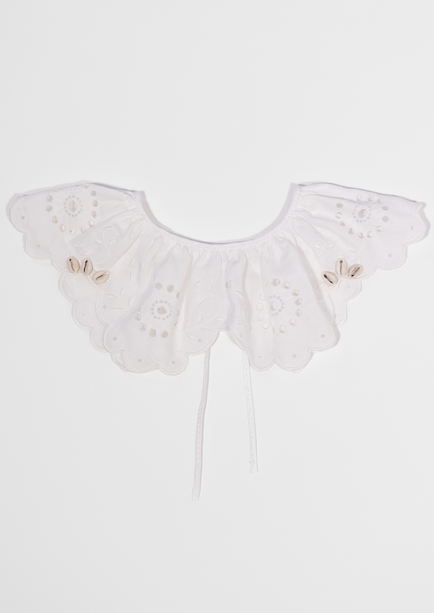 The Shell Collar can be styled on top of a lightweight jacket or worn as a necklace. It is handcrafted from a vintage embroidered tablecloth and is strewn with cowrie shells for added detail.