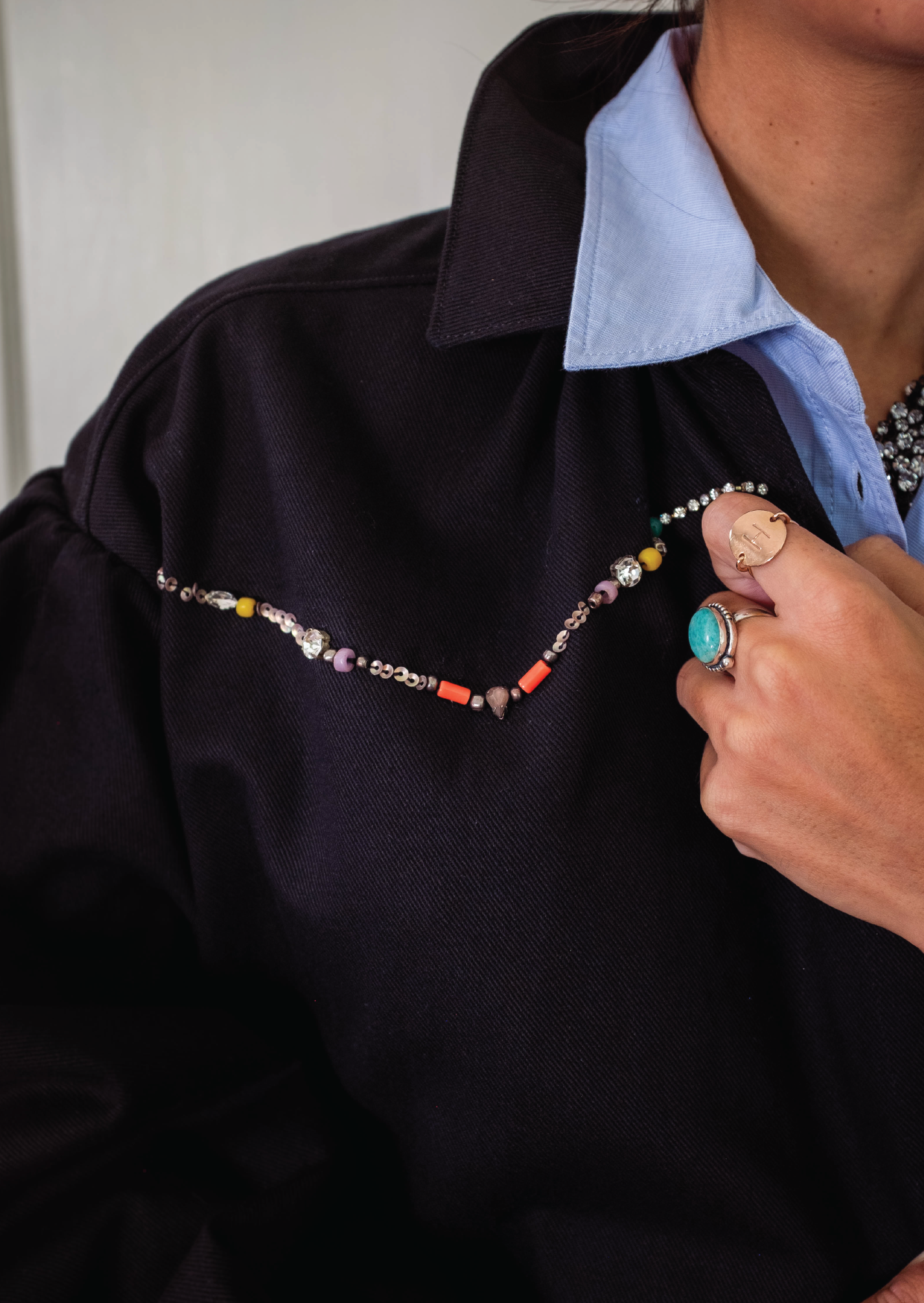 This jacket is crafted from a black cotton denim that provides a structured yet billowy look. This textile was embellished by hand with a beautiful mix of sequins, rhinestones, and recycled glass beads, giving off a starry-like shimmer. Center front button closures and two front pockets help allow for its relaxed fit.
